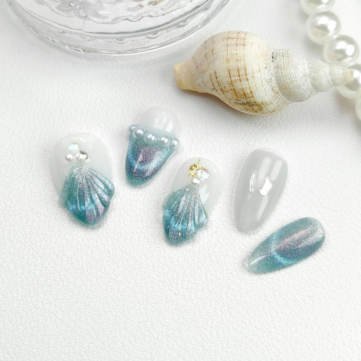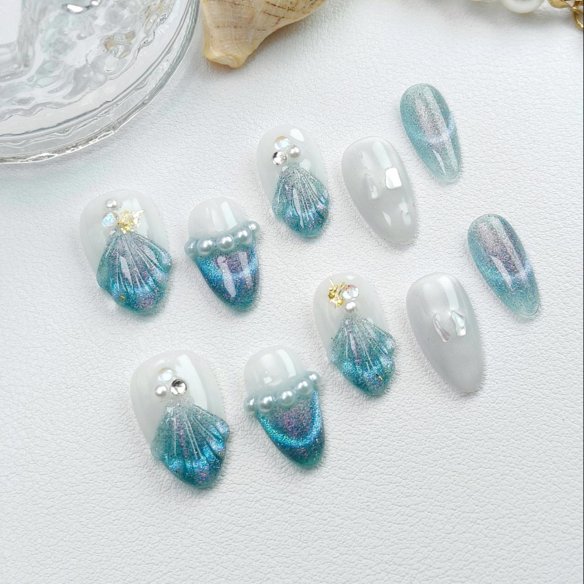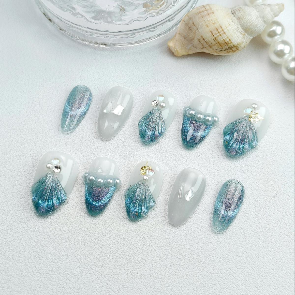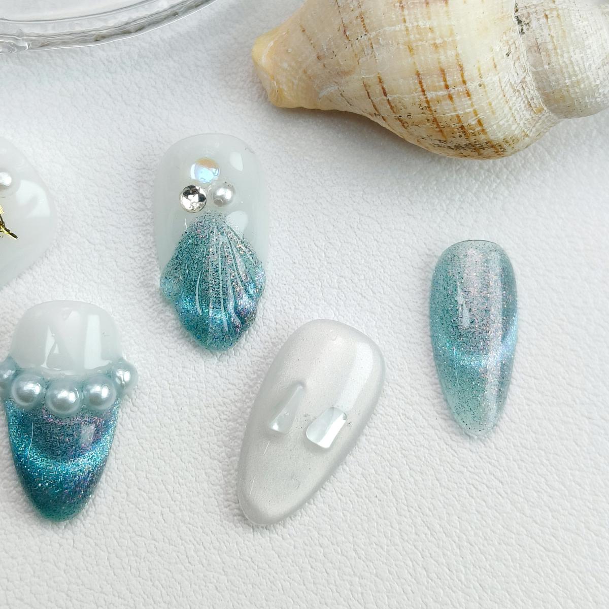 Midnight-blue gradients melt into seafoam edges, dotted with pearls and micro-glitter to mimic bioluminescent depths. For the modern siren who pairs yacht-club soirées with studio exhibitionswhere oceanic mystique meets metropolitan edge. A statement for those who wield subtle drama like a second skin.