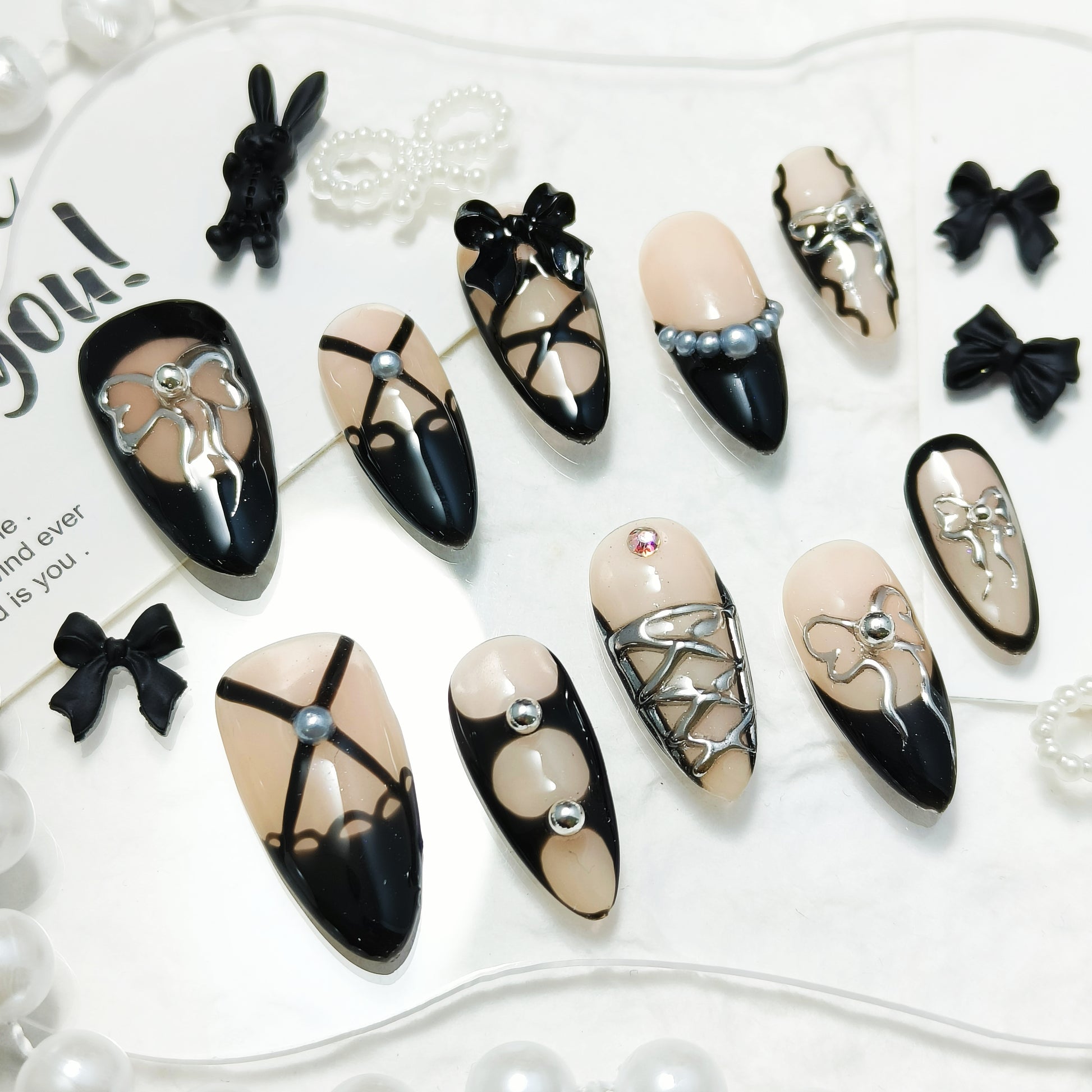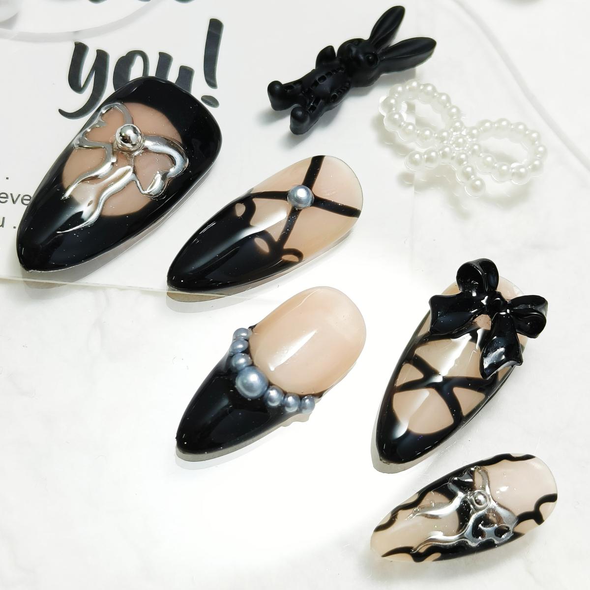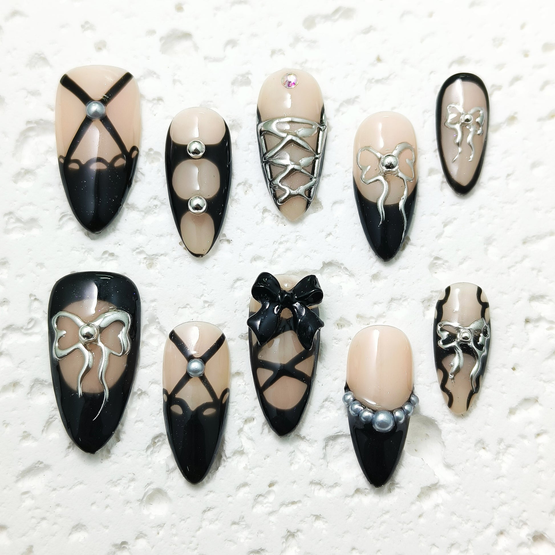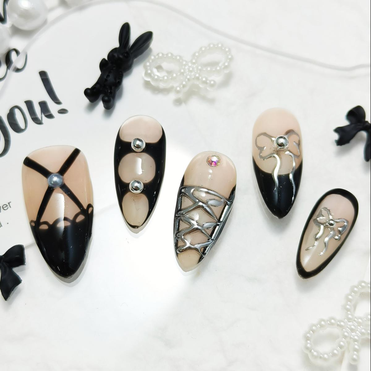 Bold black silhouettes clash with nude bases, accented by metallic lattices, dagger-like studs, and pearl-strung bows. Glimmering rhinestones and lace-inspired textures add edgy sophistication, while asymmetrical layouts balance rebellion with refinement. Designed for fearless trendsetters craving avant-garde dramaperfect for nights out or owning the spotlight. Catwoman: where chic rebellion claws its way into modern elegance.