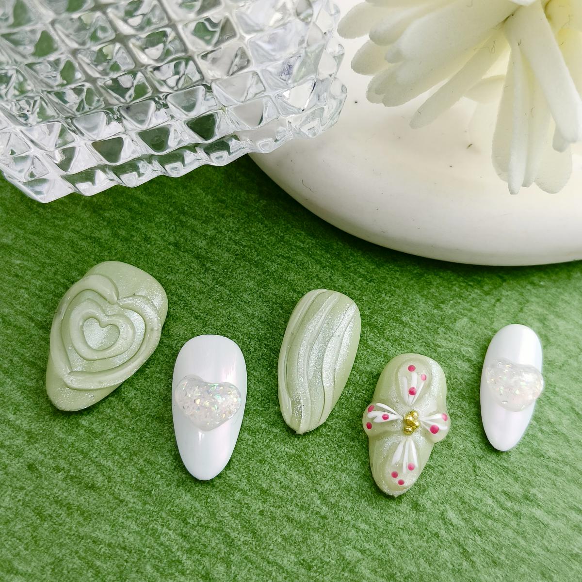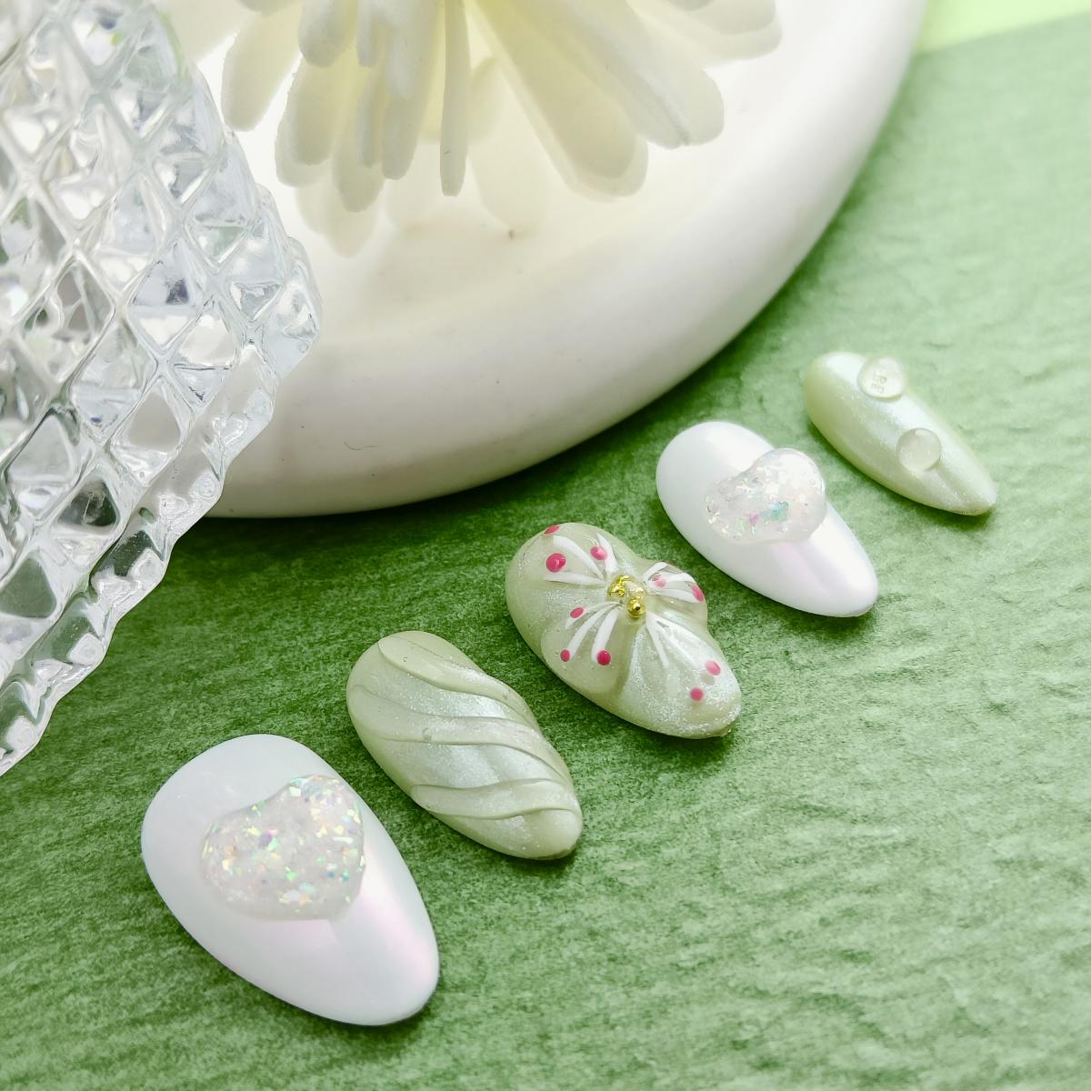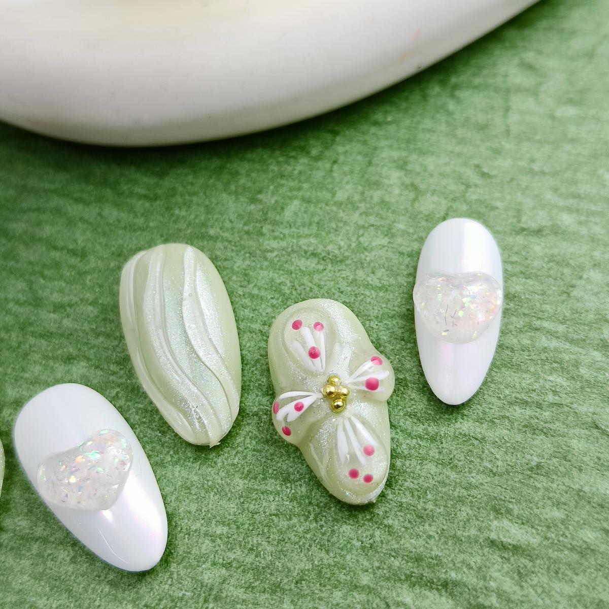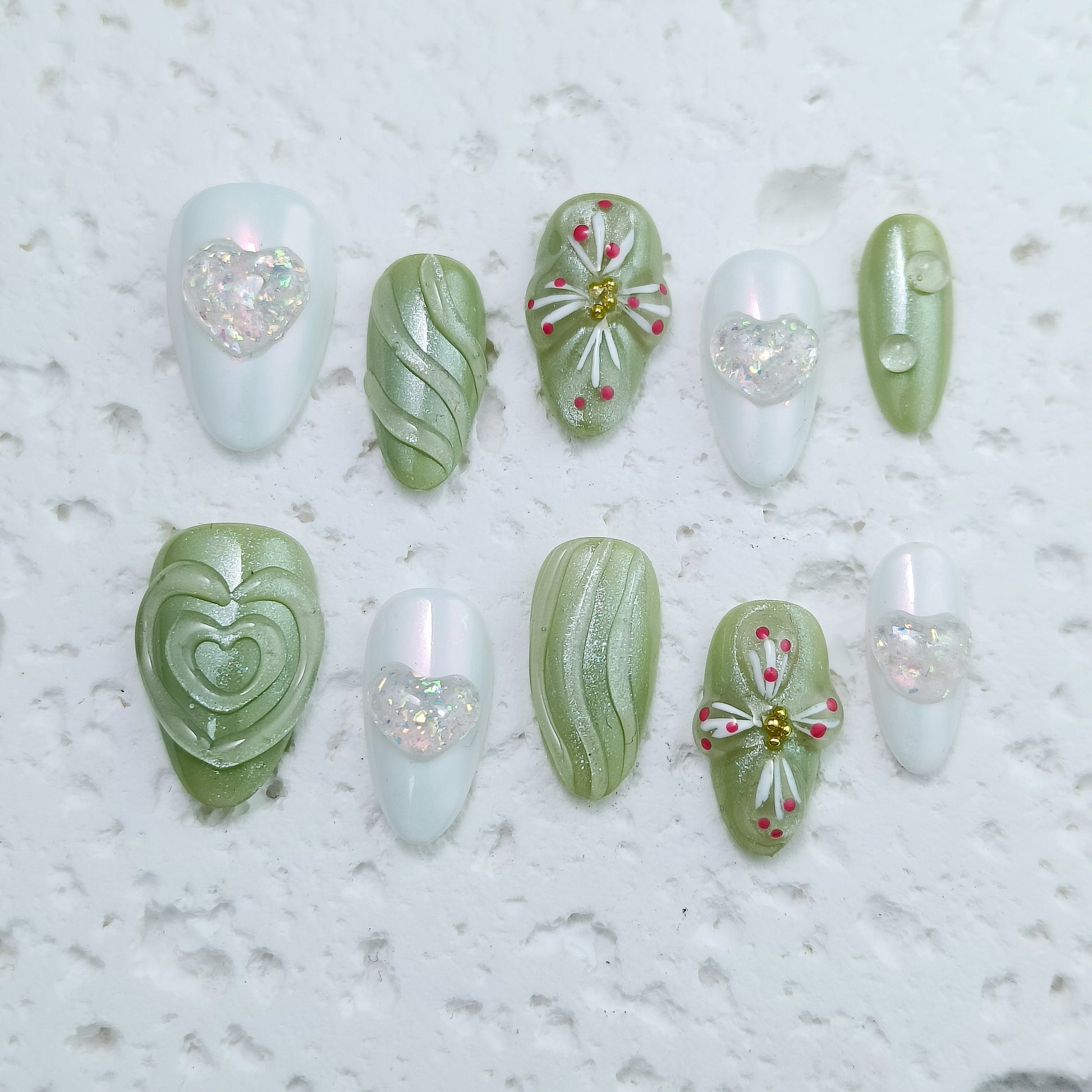 Mint-green and pearl-white gradients dance with hand-painted florals, ruby-red accents, and glittering heart charms. Delicate swirling textures mimic woodland magic, balancing minimalist bases with playful details. Designed for fairycore lovers and spring celebrationsbridesmaids, festival attendees, or dreamers craving a whimsical touch. Subtle sparkle meets storybook charm, perfect for romantic events or elevating everyday looks with ethereal grace.