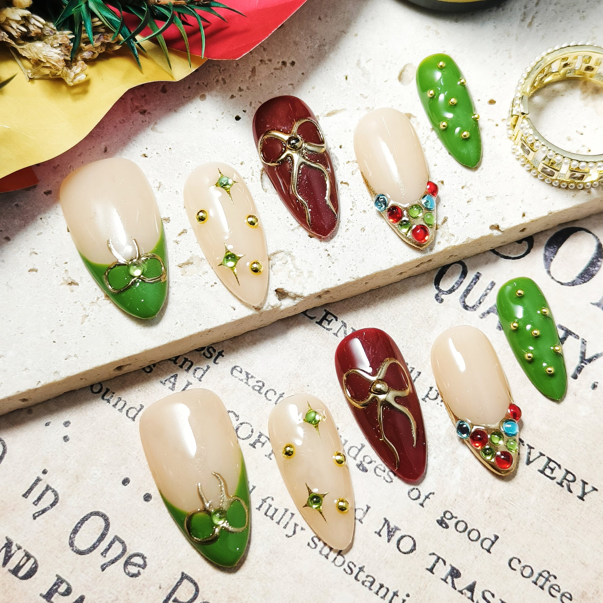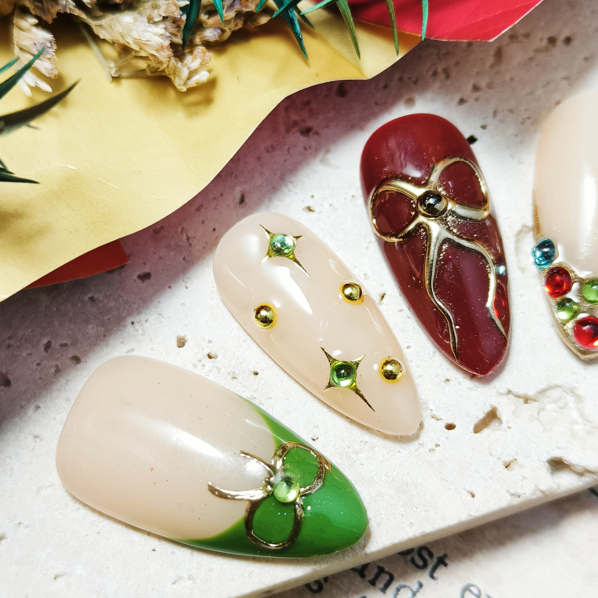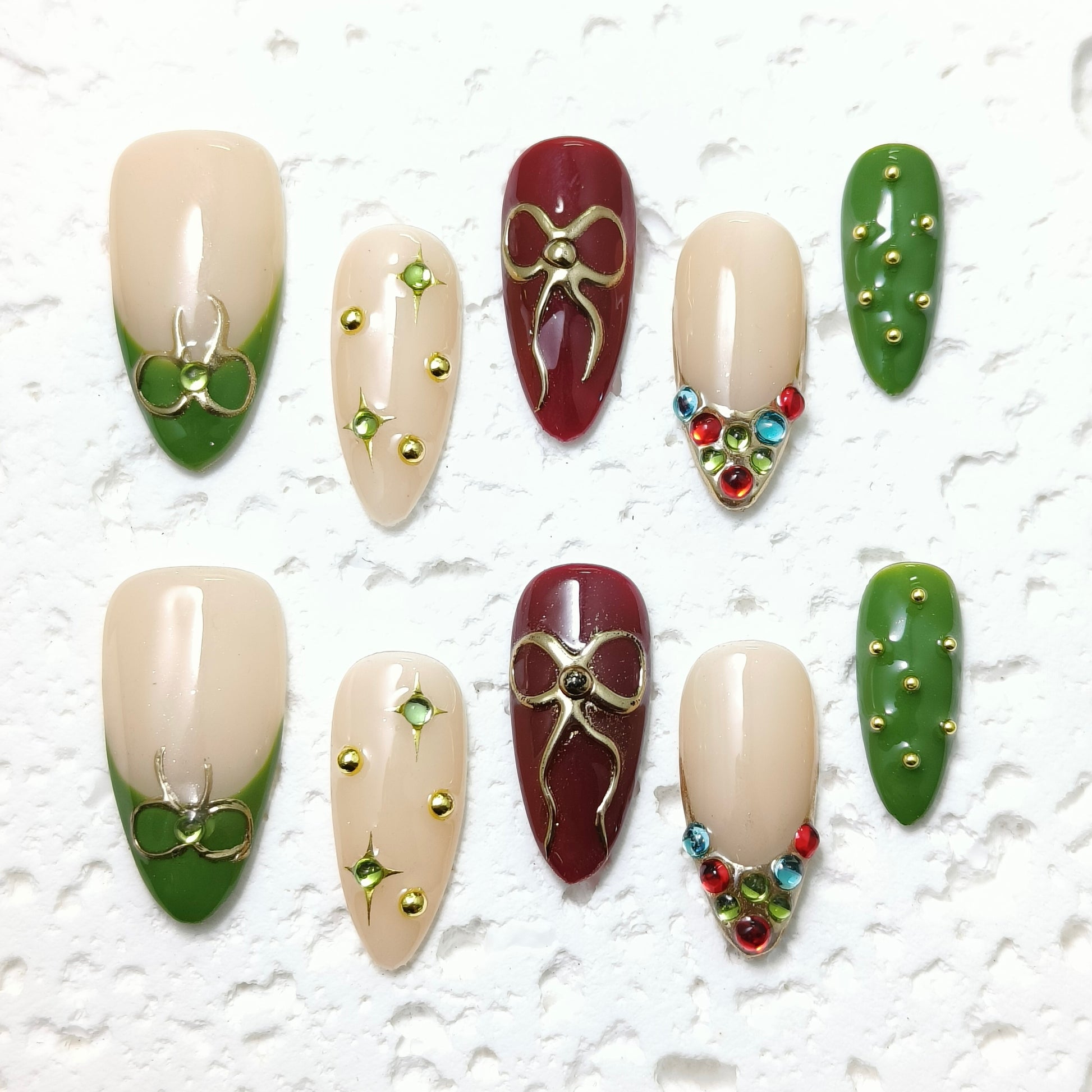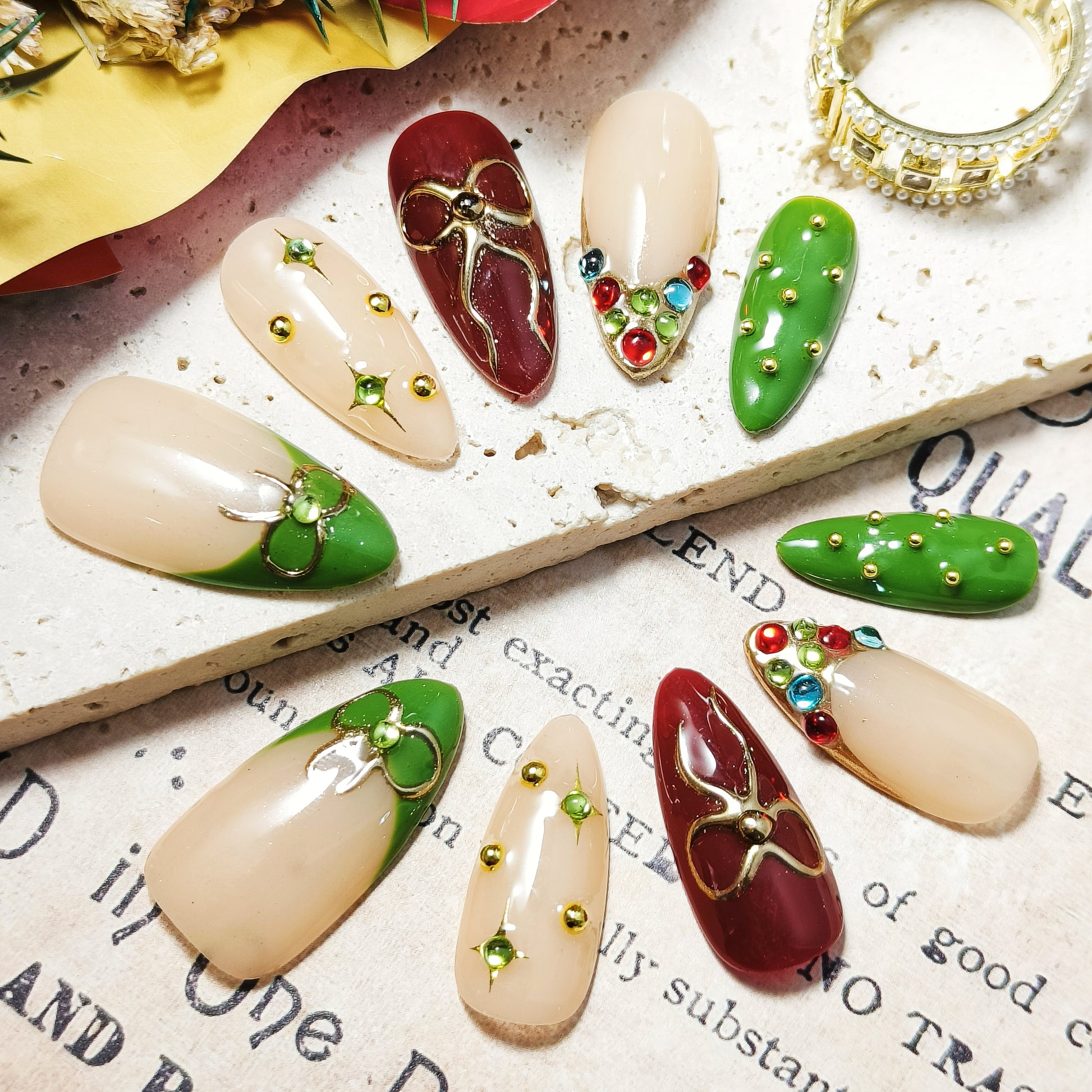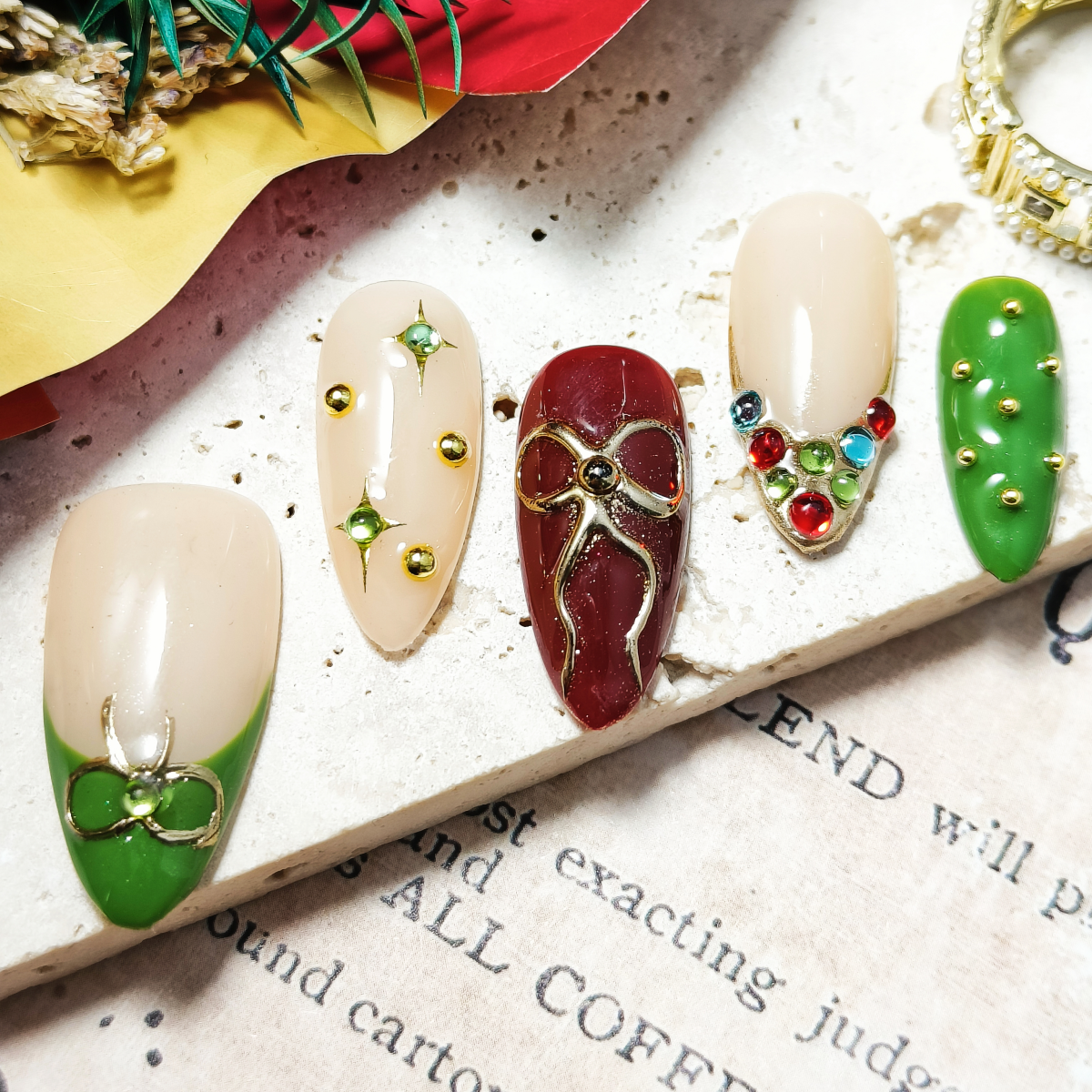 Soft cream bases bloom with metallic bows, starbursts, and gem clusters in emerald, ruby, and sapphire. Deep burgundy nails flaunt bold bows, while forest-green tips shimmer with golden studs. Asymmetrical contrasts and jewel-toned opulence cater to event planners, holiday revelers, or lovers of dramatic artistry. Midsummer Night: where fantasy becomes art at your fingertips.