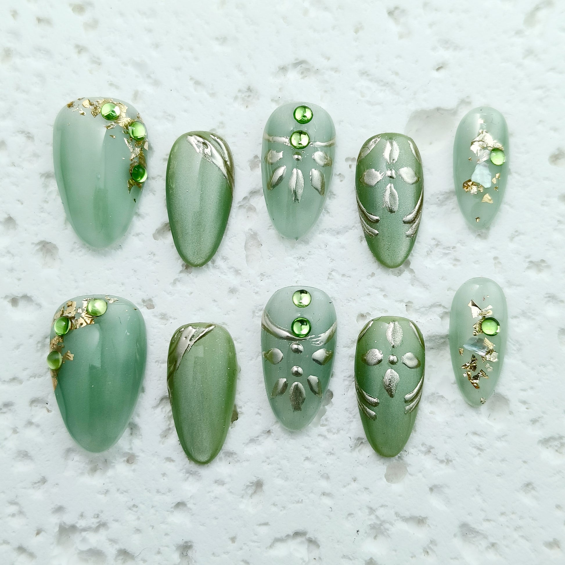 Soft olive tips blend with intricate silver leaf motifs, emerald crystal accents, and geometric negative-space contrasts. Elongated oval shapes balance organic fluidity and modern minimalism, framed by muted tones and metallic shimmer. Designed for nature-inspired elegance seekerseffortlessly transitions from garden weddings to chic urban ensembles. Olive Hymn redefines timeless refinement, where botanical whispers meet curated charm.