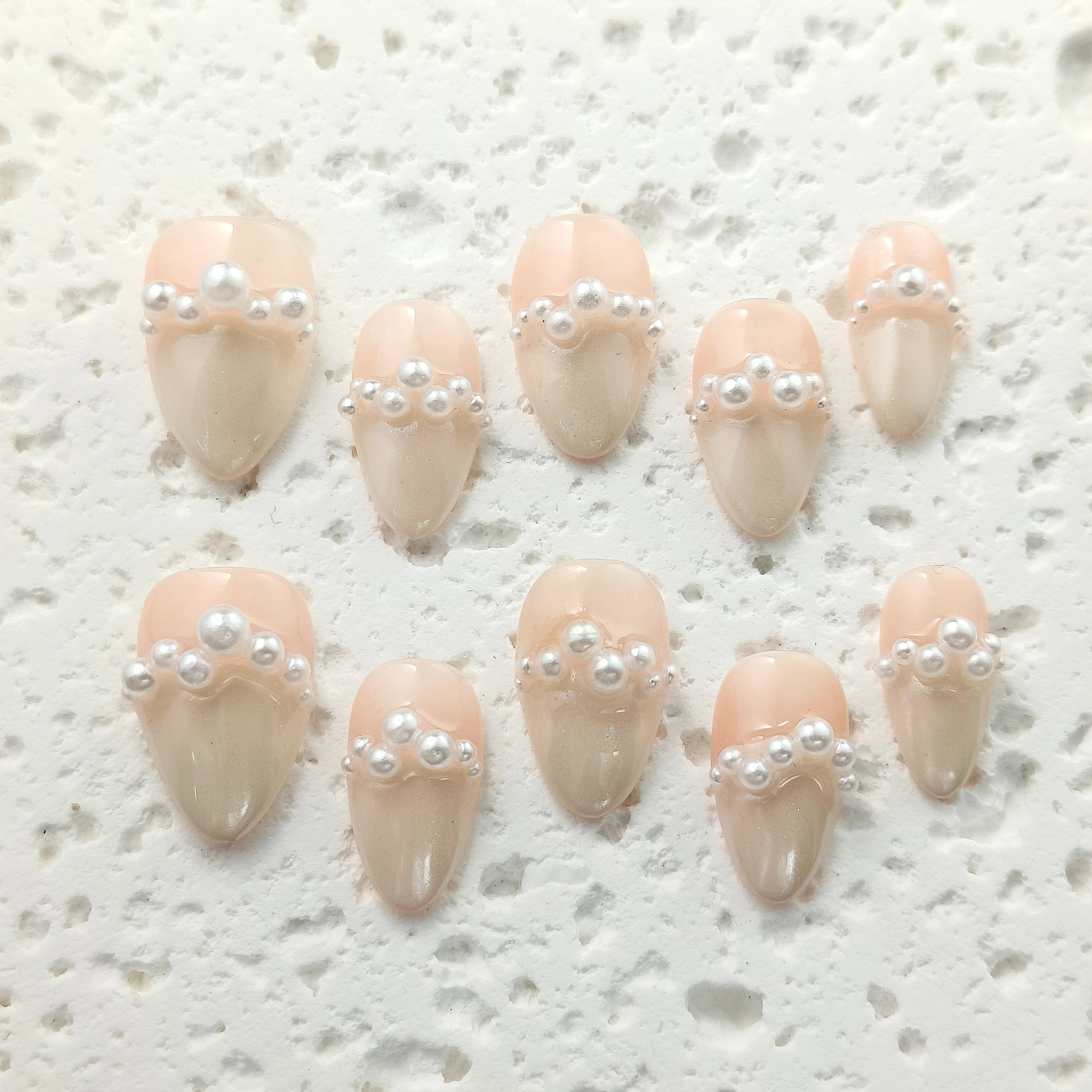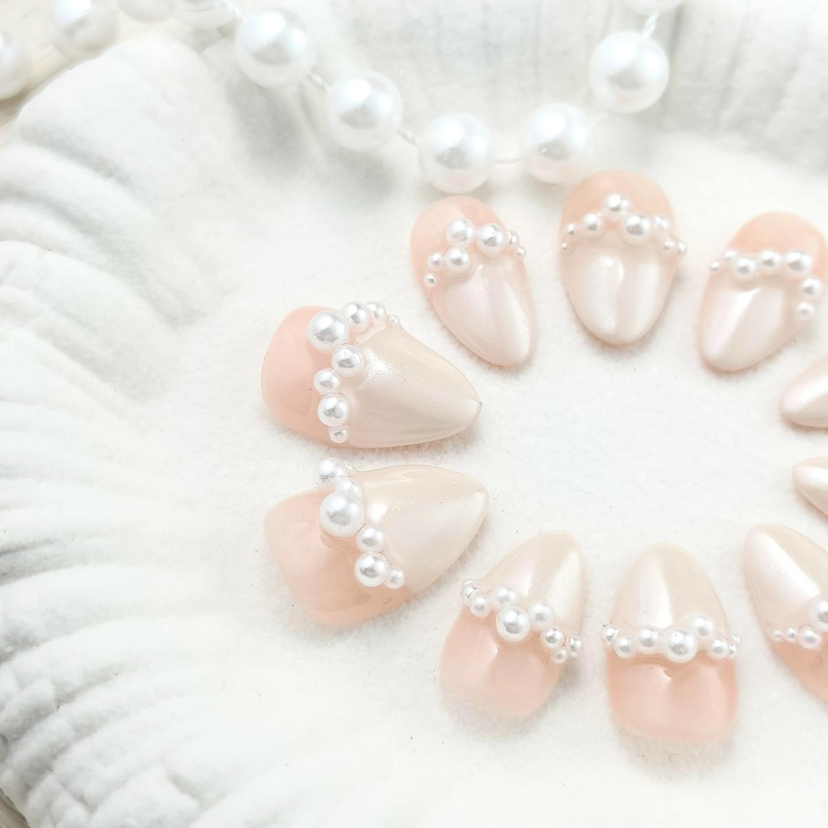 Delicate soft nude nails adorned with lustrous pearls in symmetrical perfectiona ballet of minimalist luxury. Vegan gel-like base mimics salon longevity (7+ days) with cruelty-free, damage-free removal. Designed for seamless transitions from brunch dates to evening galas. Lightweight, chip-resistant, and ethically crafted for those who crave understated elegance with artisanal precision.