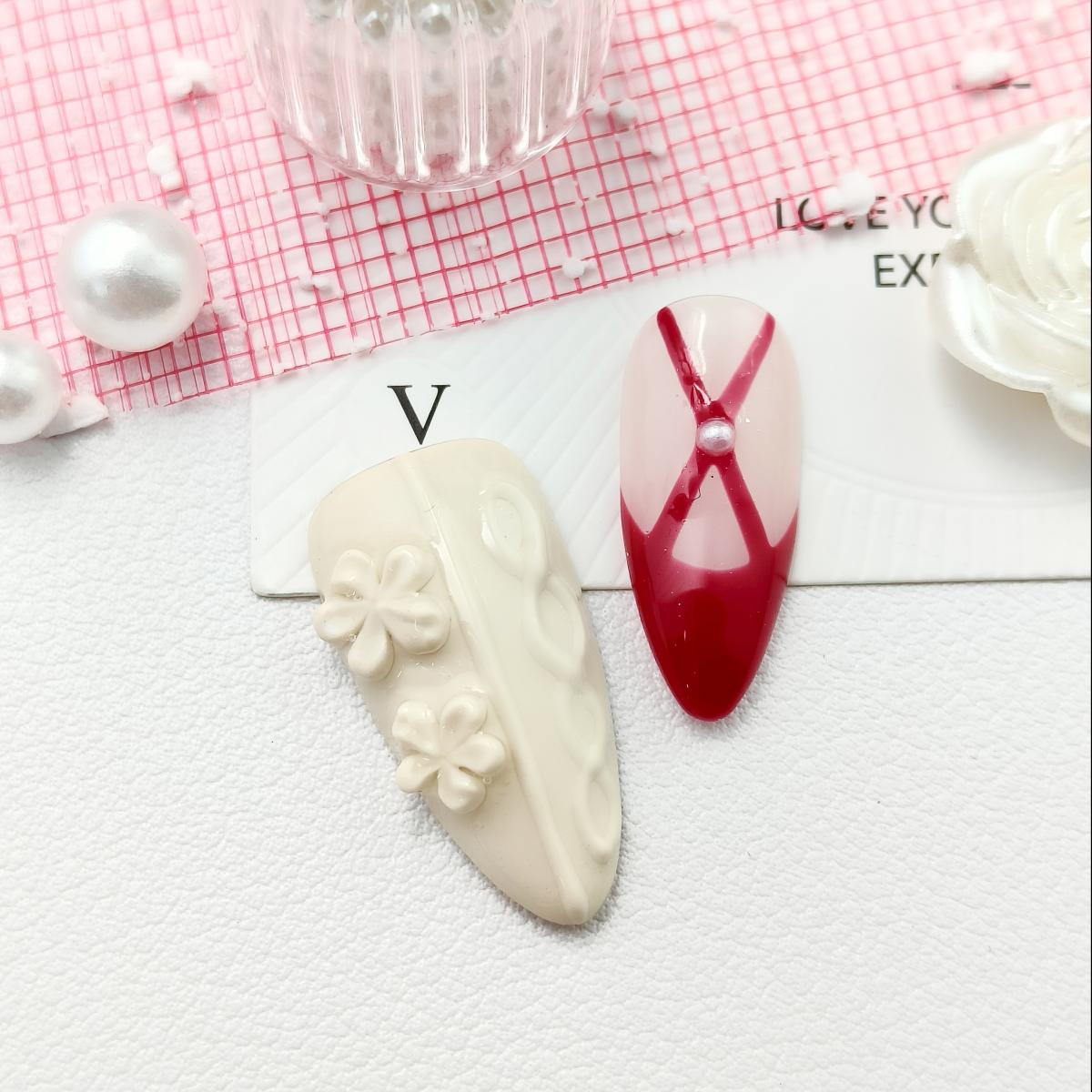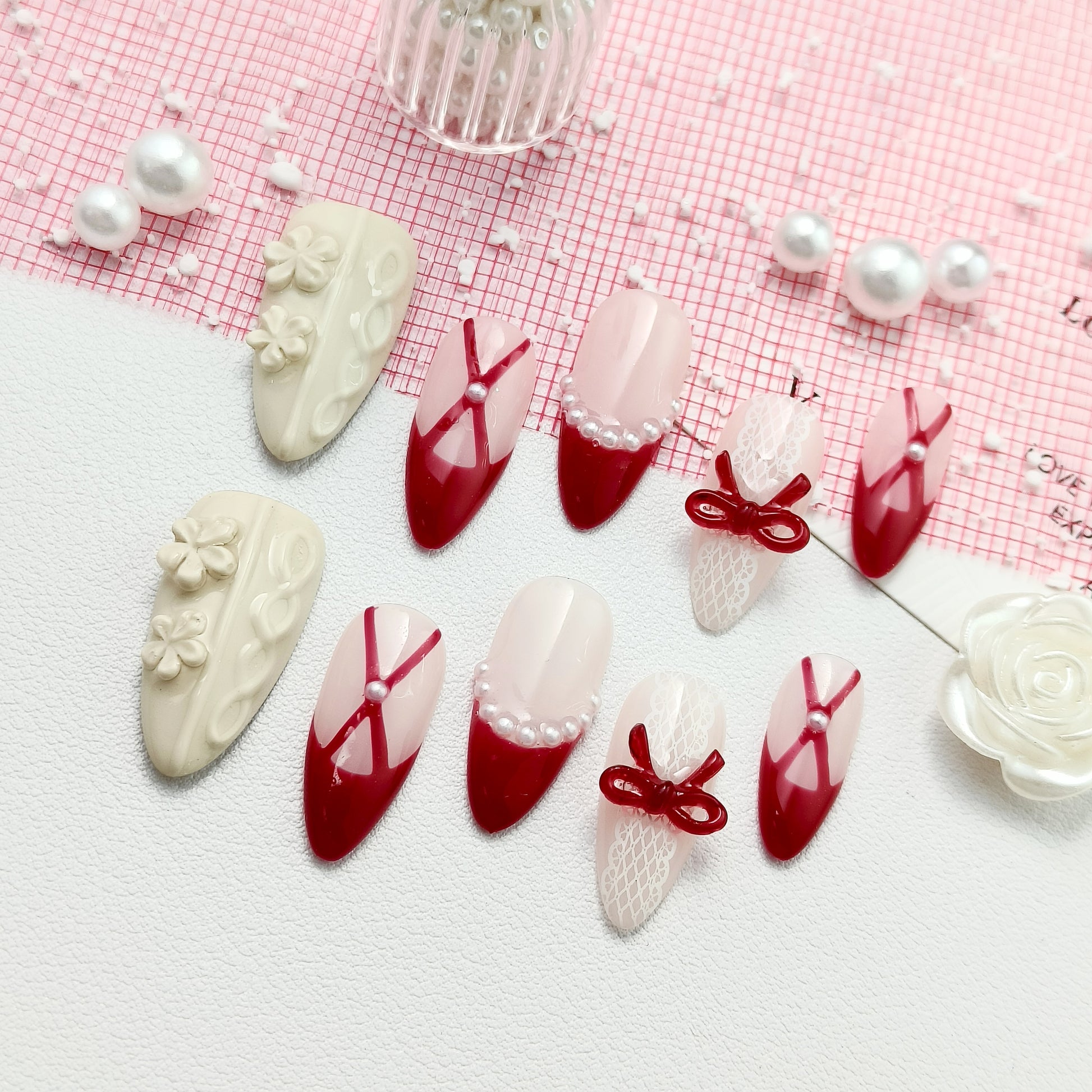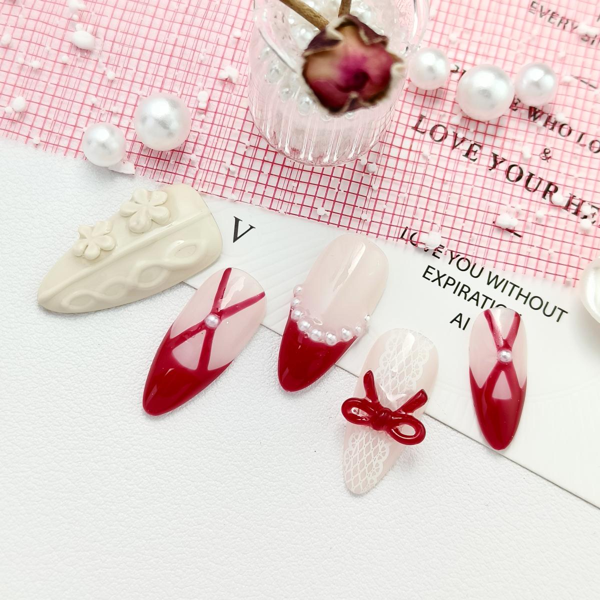Ballerina-chic meets modern minimalism: silk-red satin ribbons crisscross a pearl-white base, accented by freshwater pearls. Vegan gel-like finish mimics salon longevity (7+ days) with cruelty-free adhesive. Designed for effortless transitions from studio sessions to soiréeslightweight, smudge-proof, and ethically crafted. For those who choreograph beauty in every detail.