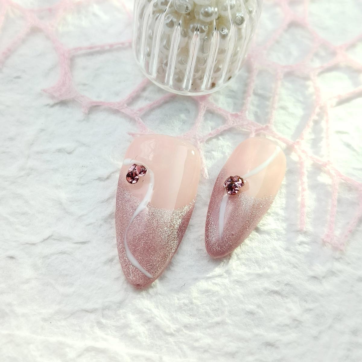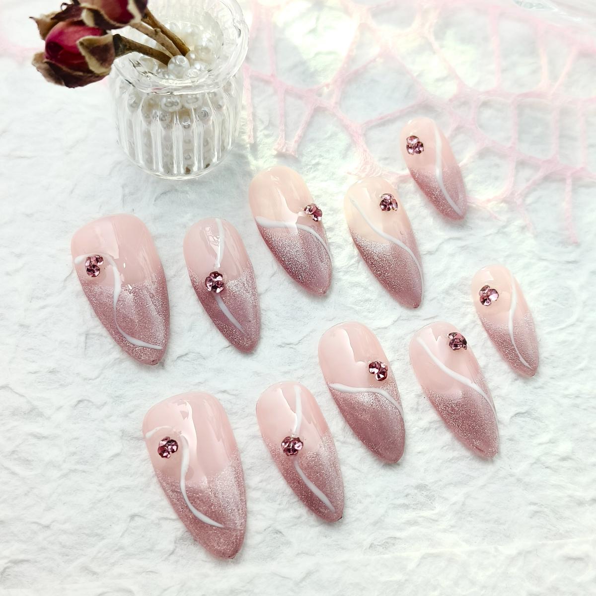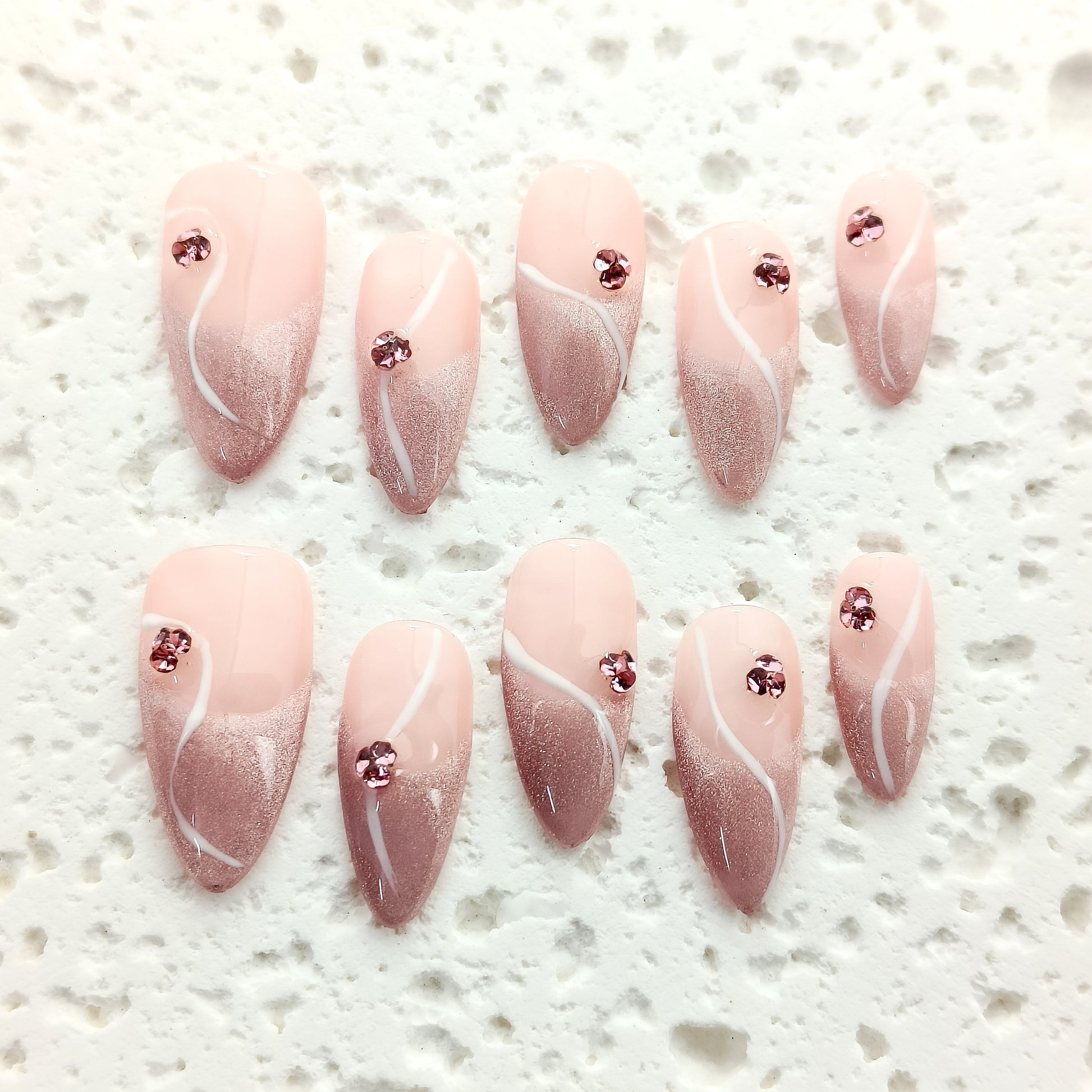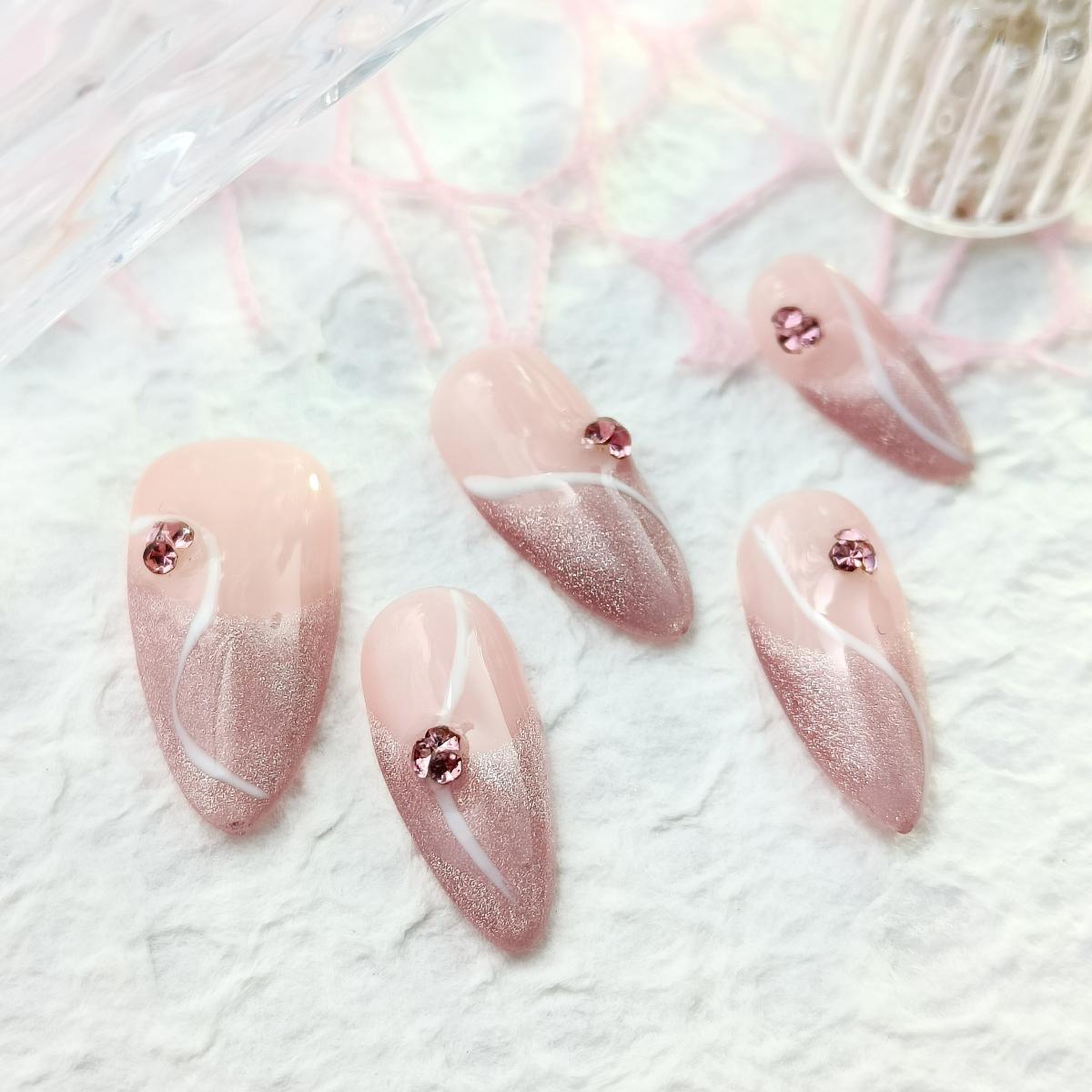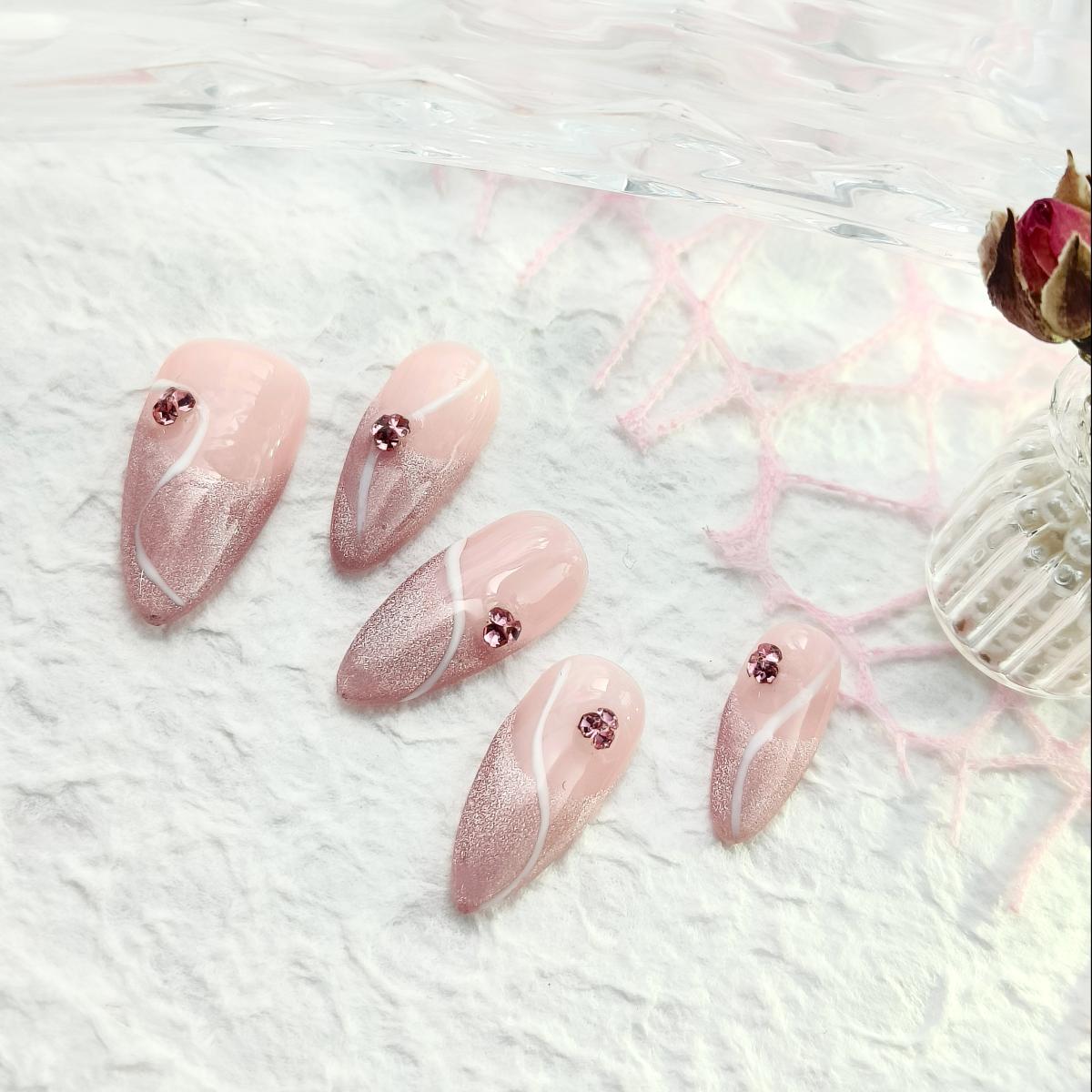 Sophisticated blush-pink nails with pearlized shimmer and hand-painted white detailing for refined edge. Sculpted to mimic gel-polish luxury, these press-ons feature a tapered almond shape and smudge-proof finish. Vegan-friendly adhesive ensures 24/7 wear with zero damage. Ideal for bridal looks, boardroom power moves, or elevating daily routines. Salon-grade durability meets minimalist artistry—effortless elegance, delivered.