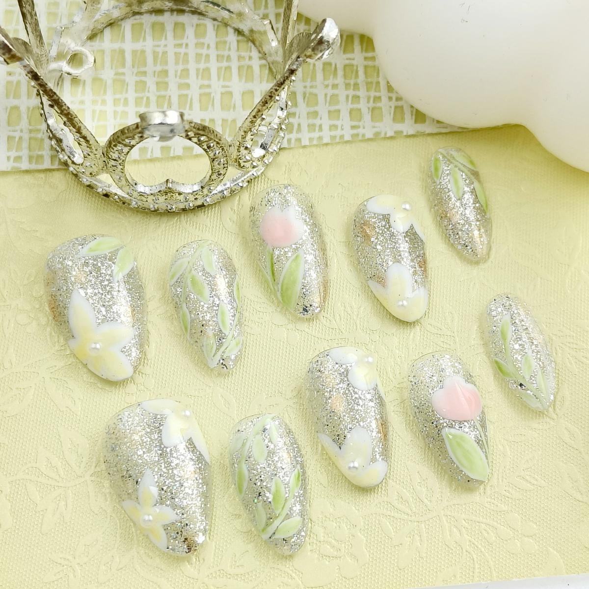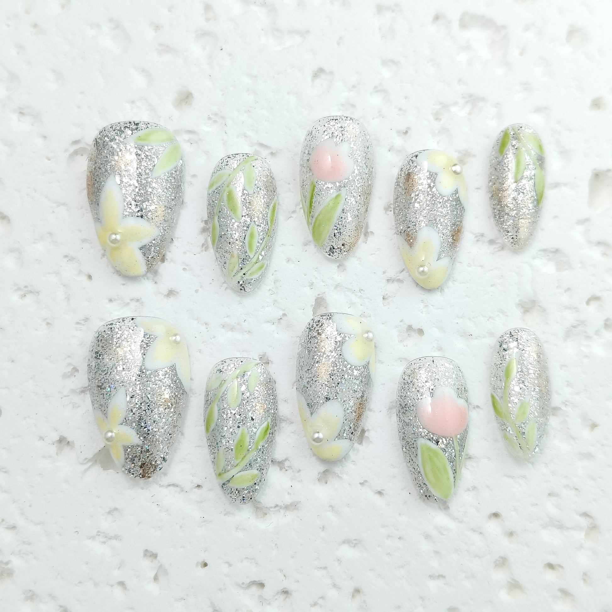 A botanical dance of metallic silver and soft pastels: almond nails bloom with white petals, blush blossoms, and rhinestone accents framed by green leafy veins. Textured silver backdrops contrast delicate florals, creating a harmony of edgy sophistication and garden romance. Tailored for fashion devotees, or minimalists craving subtle dramaequally striking in golden-hour photos or paired with sleek eveningwear. Quietly luxurious, endlessly versatile.
