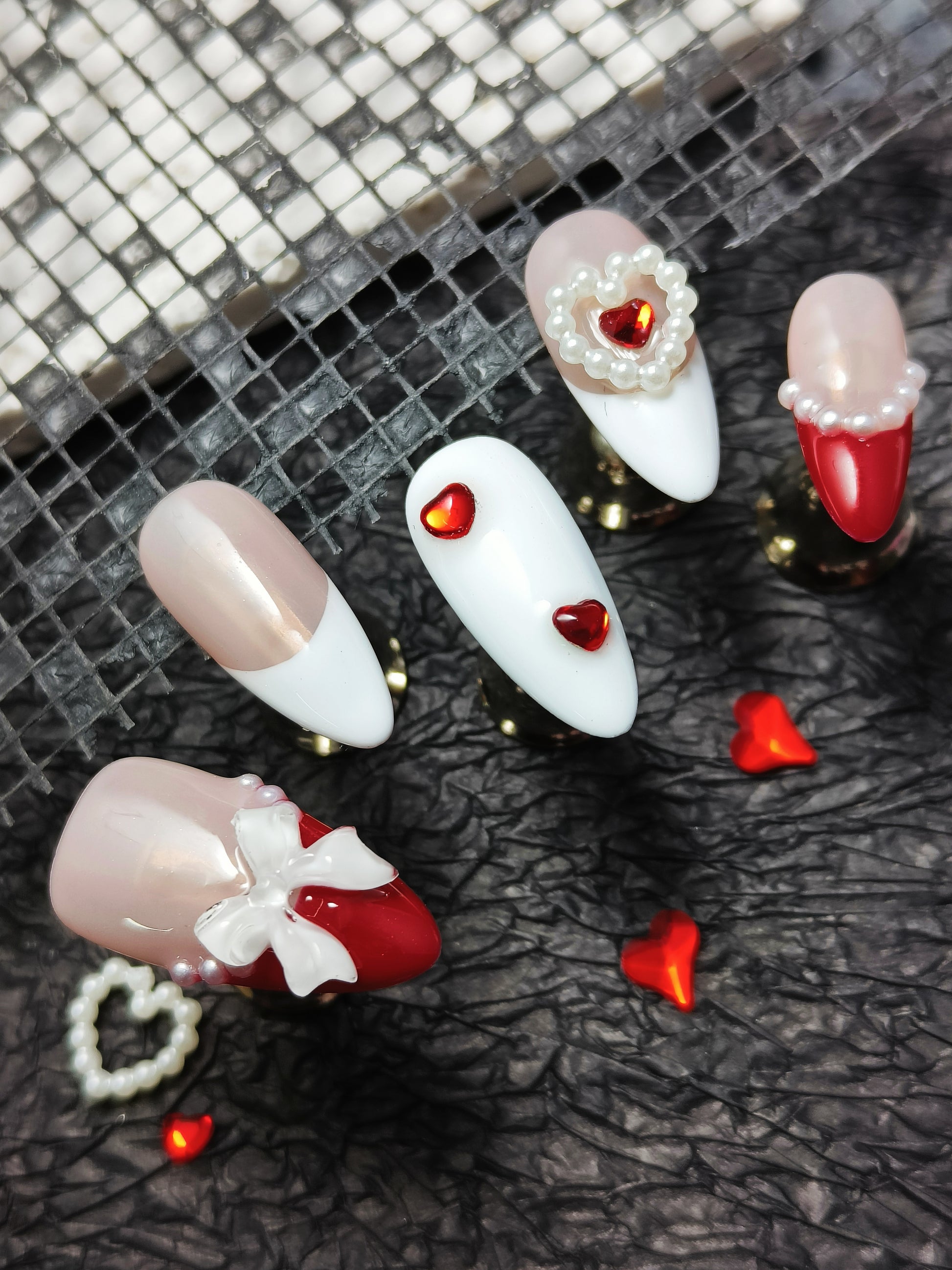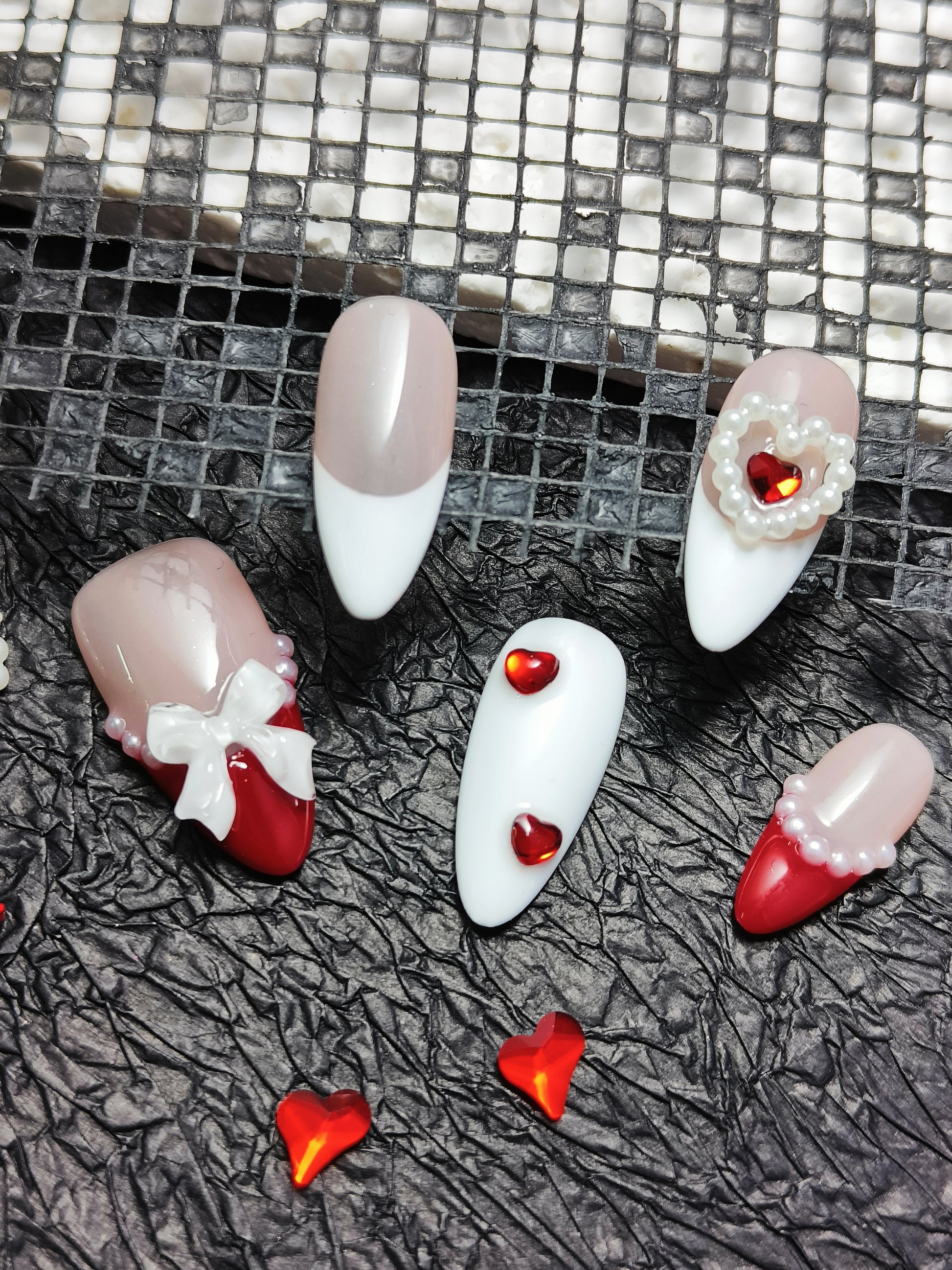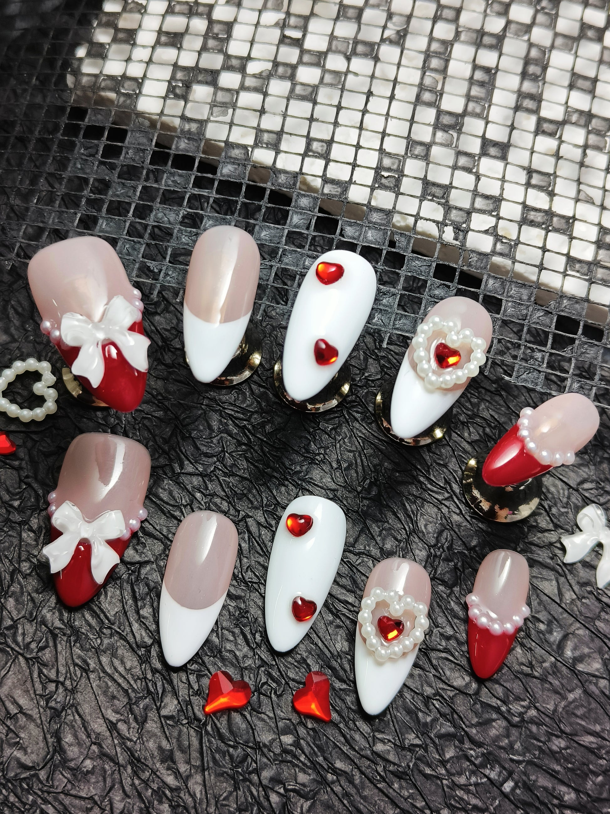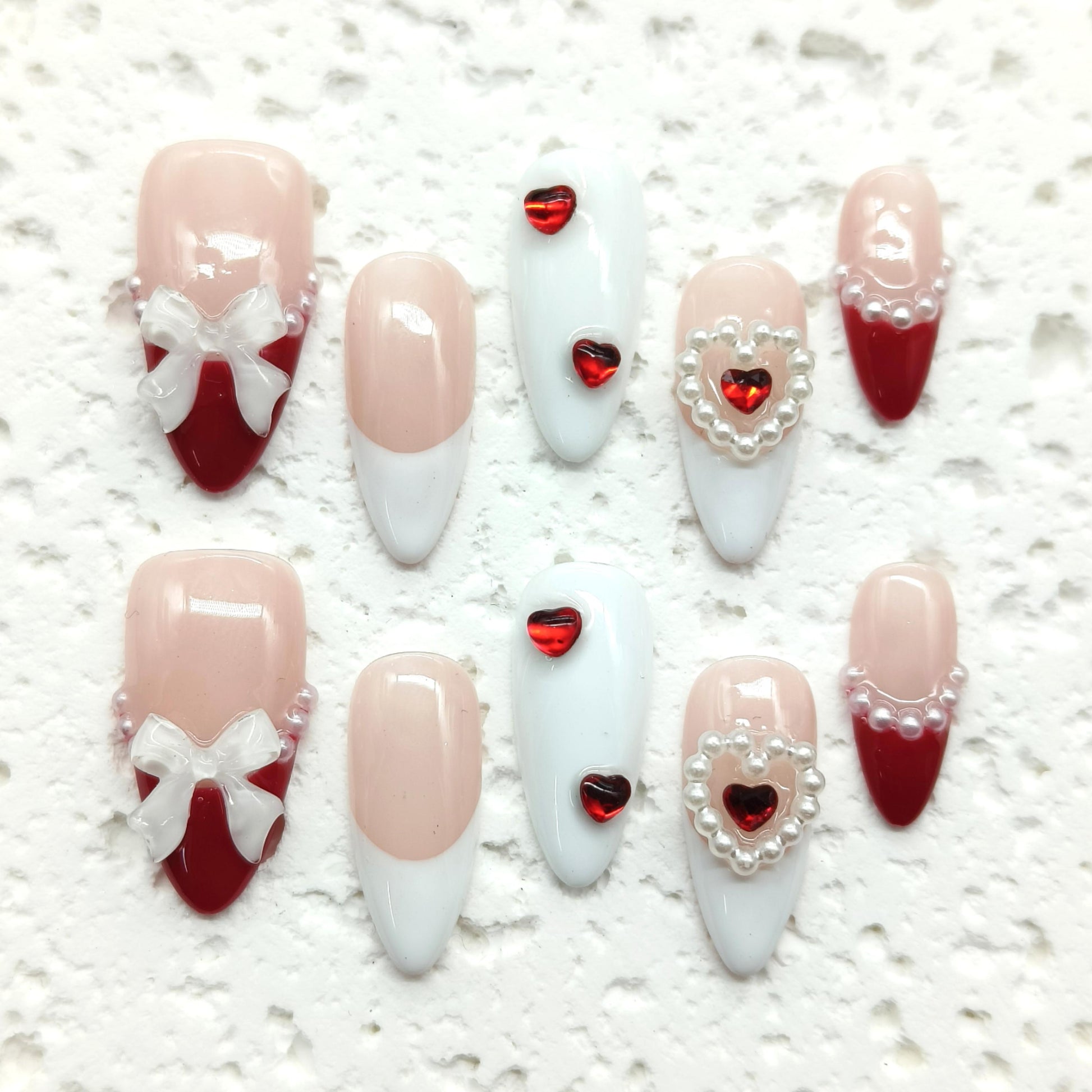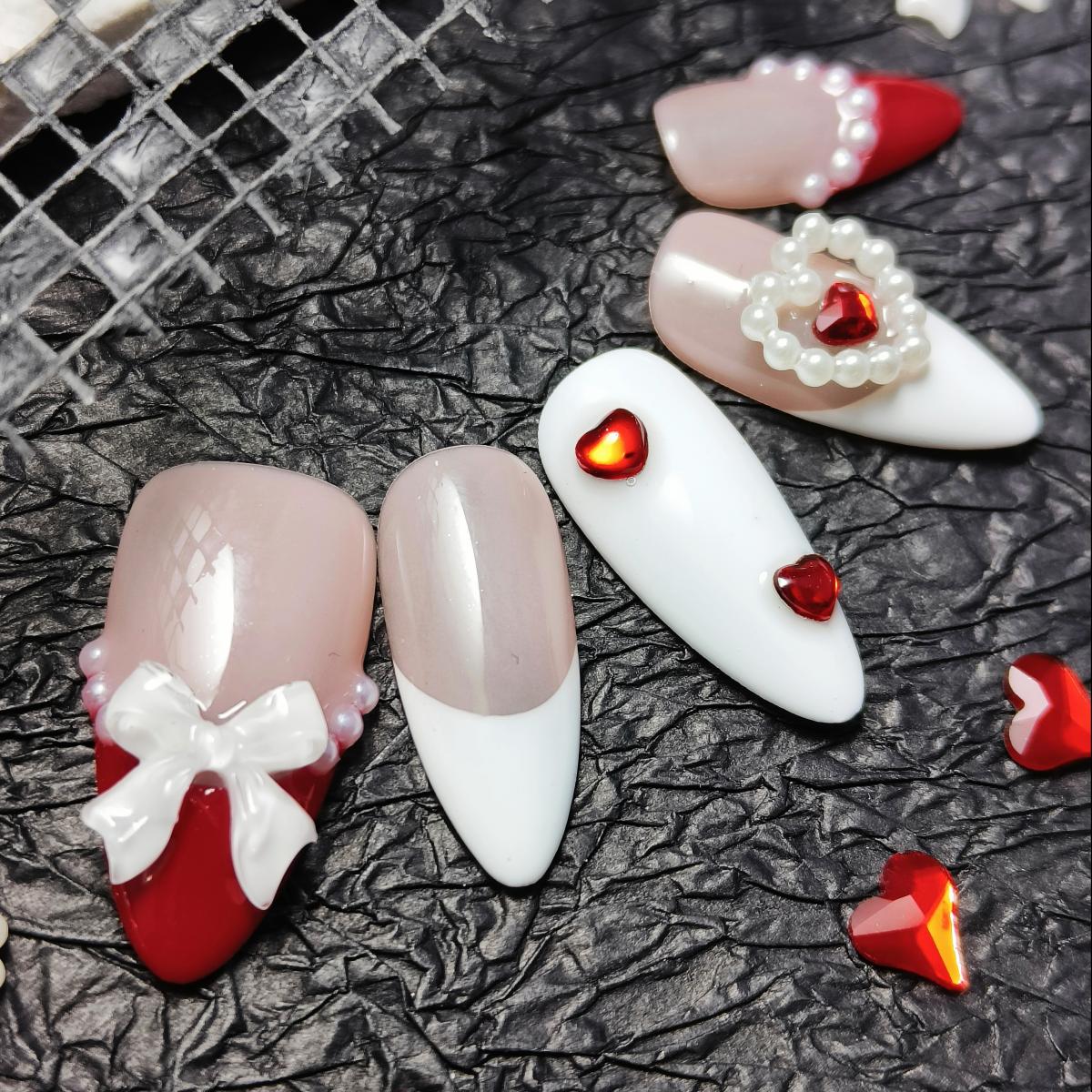 A curated clash of bubblegum pink and crisp white bases with scarlet tips, accented by pearl clusters and hand-painted bow motifs. For sorority soirées, library dates, or brunch with a twistwhere youthful nostalgia meets playful sophistication. Classic, yet unafraid to flirt with the spotlight.