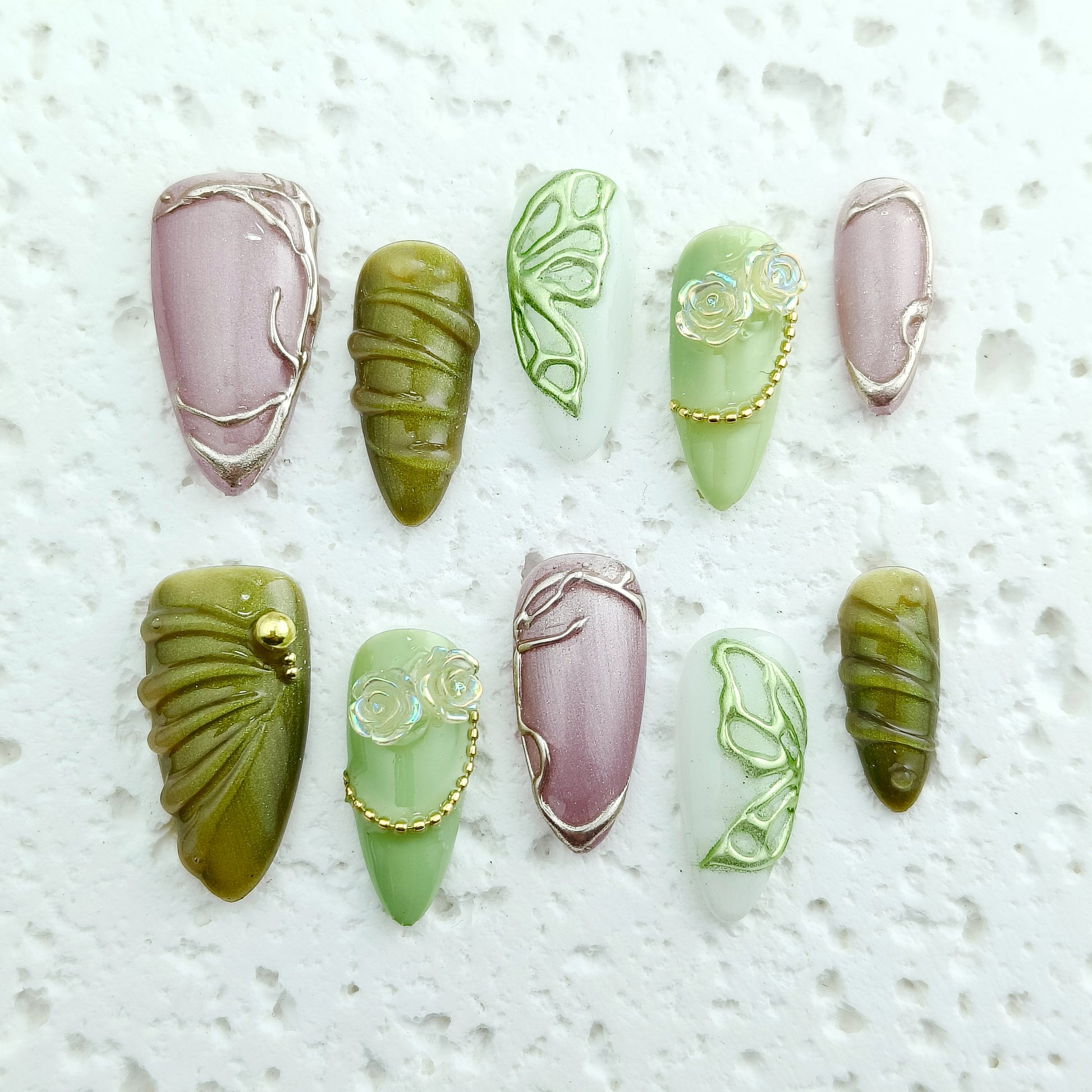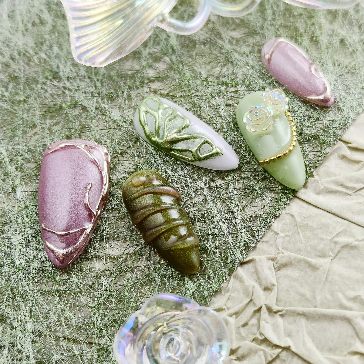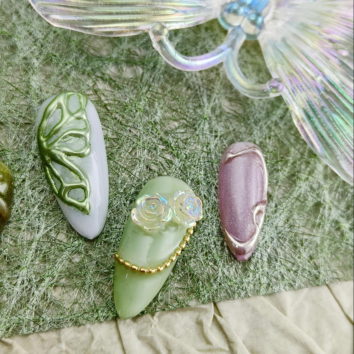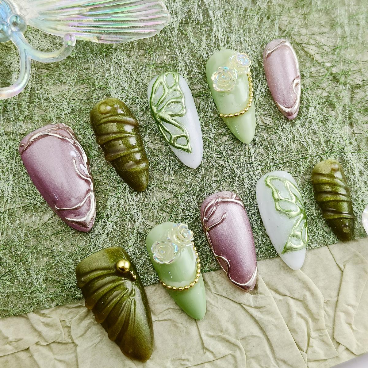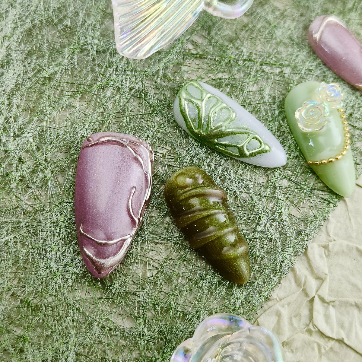 Soft lavender and moss green swirls with hand-painted leaf veins and geometric accents. Matte base meets glossy metallic edges for tactile contrast. Vegan gel adhesive ensures 7+ days of chip-free wear. For free spirits drawn to nature-inspired minimalism and artisanal detailsbridal elopements, gallery hops, or elevating everyday rituals. Sustainability meets studio-crafted allure.