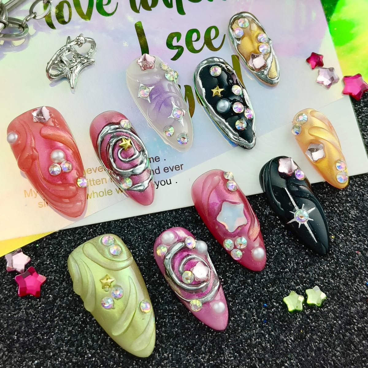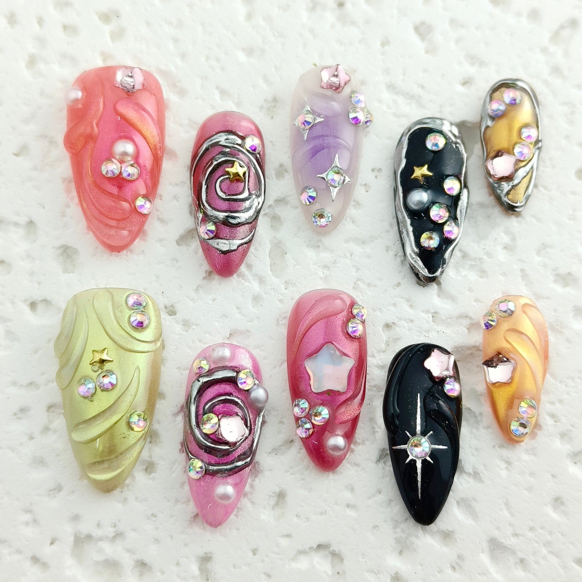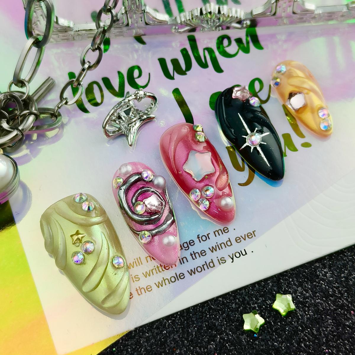 Vibrant swirls of sunny yellow, soft pink, and bold black dance with metallic accents, starburst gems, and iridescent crystals. Asymmetrical layouts balance playful chaos and refined artistrycrafted for festival-goers, trendsetters, or lovers of tropical maximalism. Tropic Fizz: where every nail is a sunlit celebration of fearless individuality.
