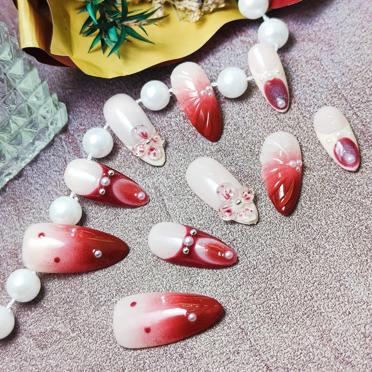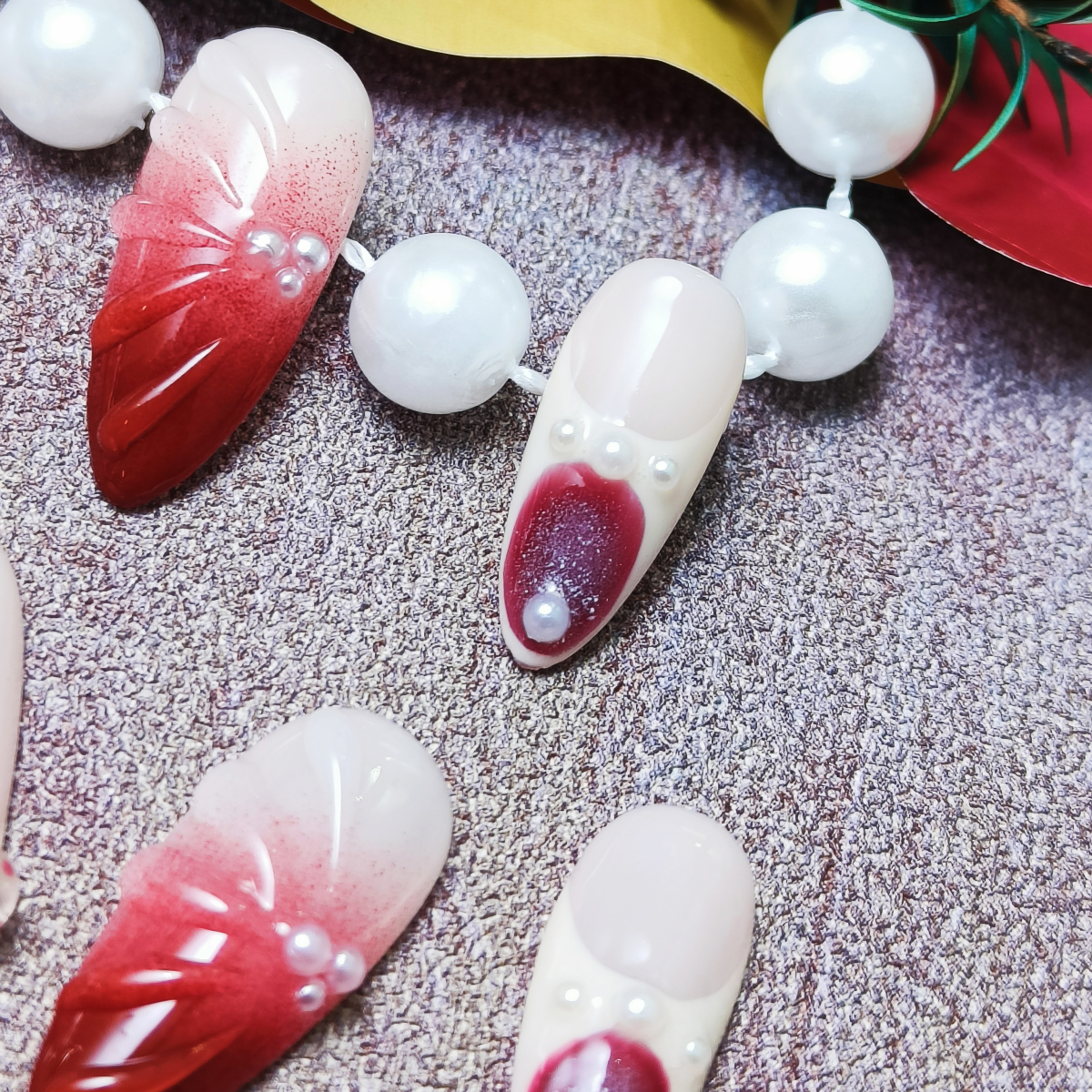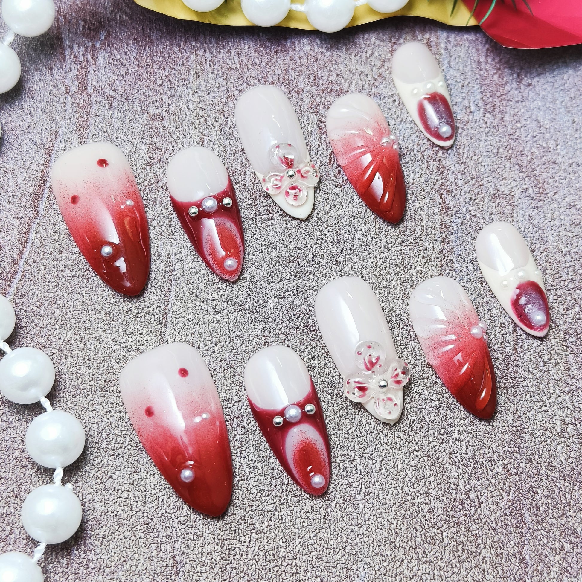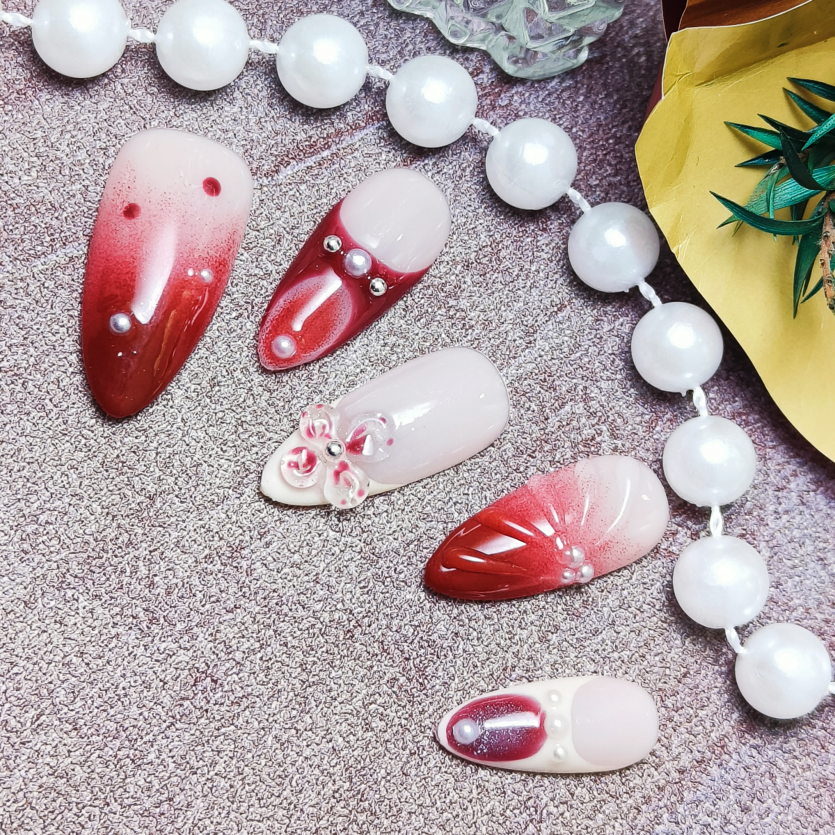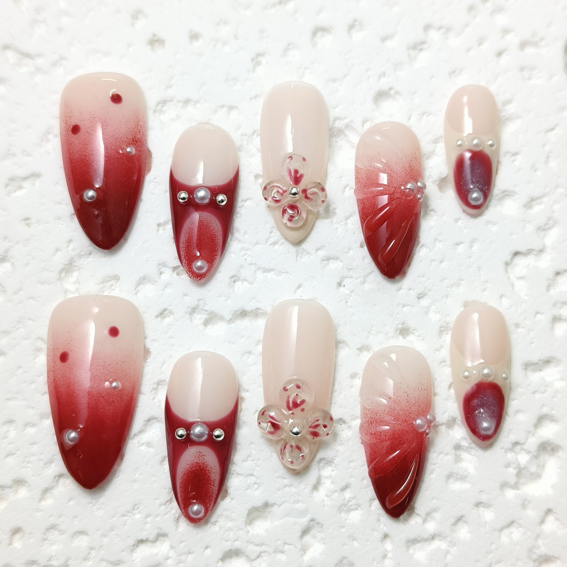 Soft nude-to-crimson gradients meet pearl clusters and translucent florals with metallic accents. Swirling red patterns add depth to this almond-shaped set, designed for brides, gala attendees, or modern minimalists. Subtle asymmetry and glossy-matte contrasts evoke curated elegance, while balanced spacing ensures timeless versatility. Velvet Ember: where refined artistry meets understated luxury.